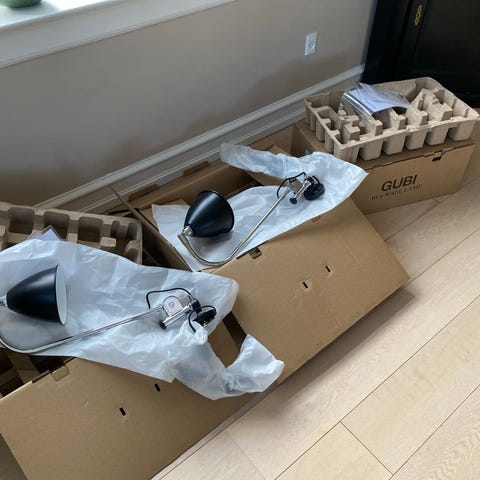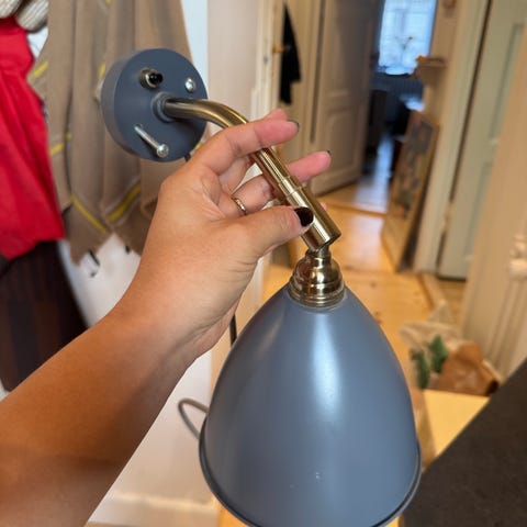 Elegant væglampe fra GUBI i sort & messing. Skærmen kan justeres efter ønske. Velfungerende tænd/sluk knap. Uden ridser og fremstår som ny. Medfølger originale skruer.
