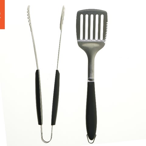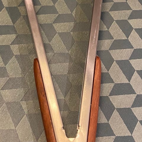 Tang eller hvad man nu skal kalde den. Med Tang i den ene ende og oplukker i den anden. Meget smart og handy at have oplukkeren tæt på, når man griller. Totallængde ca. 40 cm. Med træskaft. Aldrig brugt og helt ny.