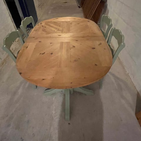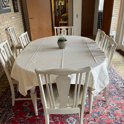 Ældre hvid spisestue med patina. Den består af bord med 8 stole, stor skænk, lille skænk og højskab. Polster og stof på stolene er i meget fin stand.