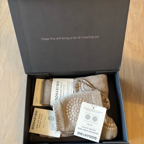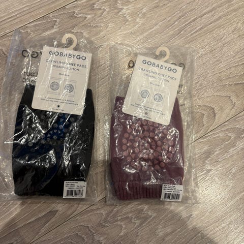 Andet, Skridsikre knæbeskyttere til baby, GoBabyGo, GoBabyGo skridsikre knæbeskyttere til baby der er ved at lære at kravle, så baby nemmere kan kravle over glatte overflader som trægulv eller klinker. De er foret med frotté indvendigt, som giver ekstra komfort. Knæbeskytterne har gode, ribbede elastikkanter omkring åbningerne, så de sidder godt fast.