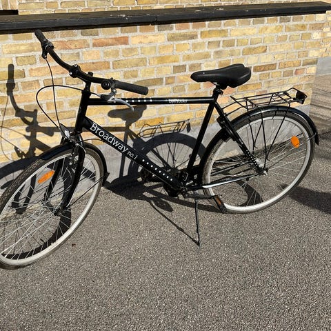 Cyklen har for- og baglygter, bagagebærer og skærme – og er klar til brug.