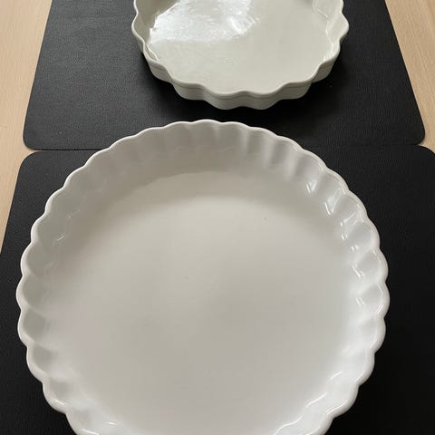 2 hvide ovnfaste tærtefade sælges for 25 kr/stk. eller samlet for 40kr