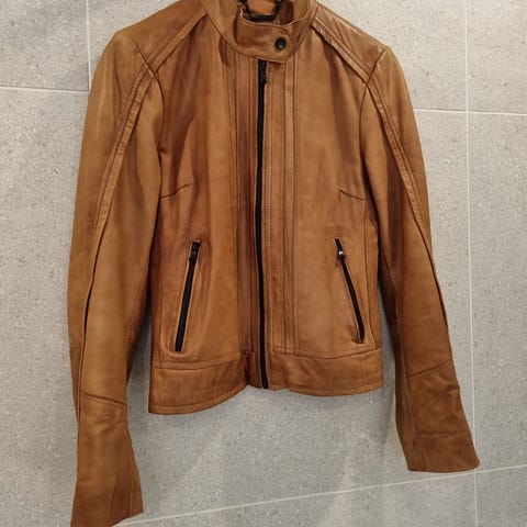 Dejlig jakke i kunstlæder, foret og let taljeret. Der er Lynlås foran og stiklommer i begge sider. Flot stand, ingen slid, fejler intet, nærmest som ny. Mrk. Soyaconcept str. 42. Brystvidde 104 cm. Vægt 530