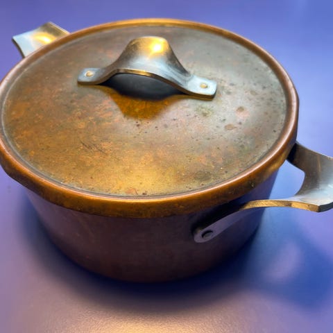 Kobbergryde, rustfrit stål indvendig, med låg. Antagelig Polaris. God lille saucegryde Rummer ca. 1,25 L. Diameter 17 cm, Højde 8 cm