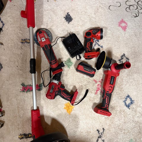 El-værktøj + Bosch skruemaskine + håndvask + tøj + sko + løbehjul + . Elektriske ting virker og ting virker ikke