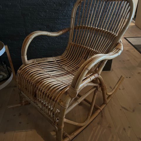 Stor gyngestol i flet af bambus og rattan. Virkelig flot retro vintage bambusgyngestol. Fremstår med almindelige brugsspor.