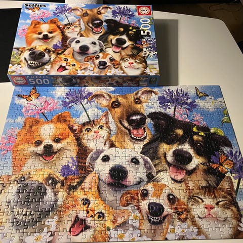 Puslespil med 500 brikker. Lagt én gang og er pænt lagt tilbage igen efter den ene gang og jeg kan stå inde for at hver og en eneste brik er i kassen :) god fornøjelse!