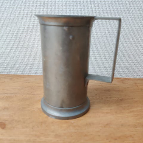 Tin krus m/låg, H 14 cm, Ø 9 cm. Stemplet ved hanken, i fin stand. Fra et røg- og dyrefrit hjem.