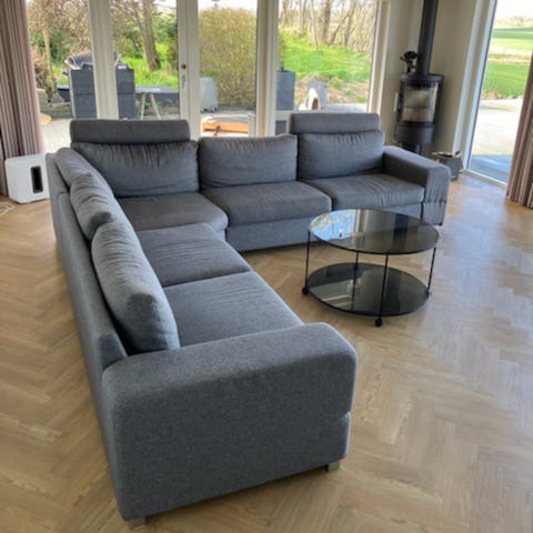 ▪ Luksuriøs, bred beige sofa med fløjlslignende stof og bølget struktur. Den giver både komfort og hygge med mange bløde puder.