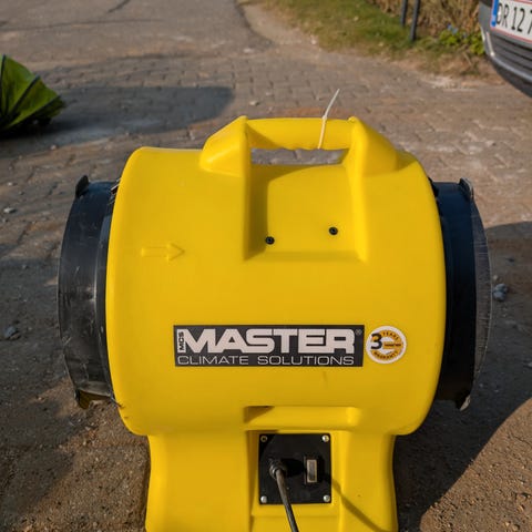 Briggs & Stratton motoriseret blæser udstyret med håndtag og hjul for mobilitet. Enheden har et robust metalhus og en motor, der er velegnet til udendørs brug. Designet med to håndtag for nem håndtering og transport. Passer til opgaver, der kræver luftbevægelse eller blæsning.