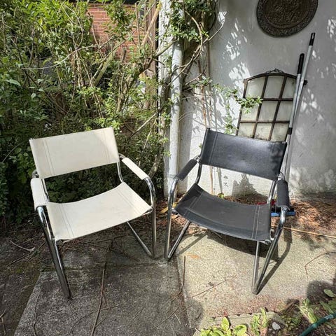 Standen er pæn, alderen taget i betragtning. Forkromningen er uden anløb eller rust. Læderet er blødt og lækkert med en jævn patina. På en 1-10 skala vil jeg vurdere stolenes generelle stand til at ligge på en 8’er.