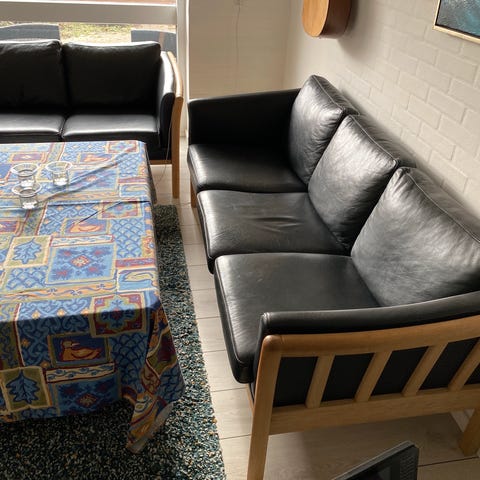 ▪ Sæt 3+3+1 med puf. Møblerne er betrukket med sort kunstlæder . Et klassisk design, der passer godt til både moderne og traditionelle hjem. Brede armlæn og dybe sæder sikrer maksimal komfort.