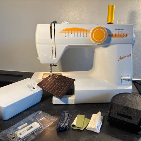 Som sagt medfølger der en kasse med cams, trykfødder og andet udstyr. Kassen ser ud til at være helt intakt med det orginale udstyr. Den bruger alm. symaskinenåle, ekstra nåle medfølger og trykt manual. Desvære er der ikke en orginal manual med, men den kan sikkert med lidt tålmodighed findes på "nettet".