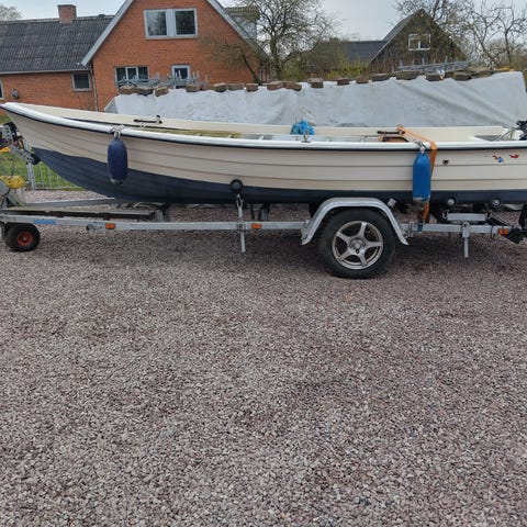 Udbyhøj Fladbundet jolle på 13 fod. Med lukkede dam.