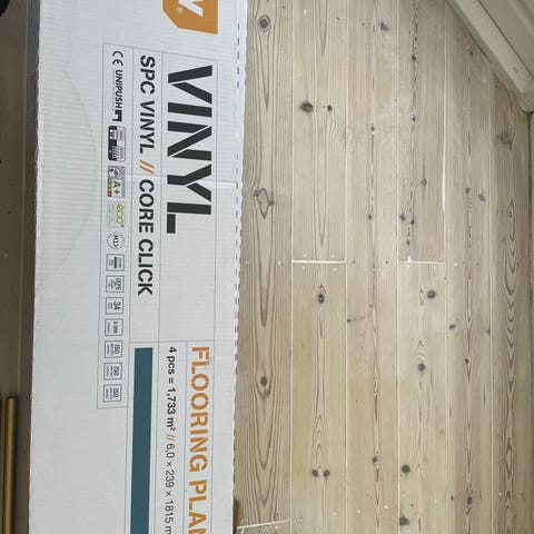 Helt nyt vinylgulv der har stået i en overdækket terrasse. Der er 20 pakker så ca. 50 m2. (Hver pakke indeholder: 27 stk. Amtico Spaces Pale Ash (91,4x10,16 cm) = ca. 2,5m.) Meget slidstærkt. Nypris ca. 19.600.