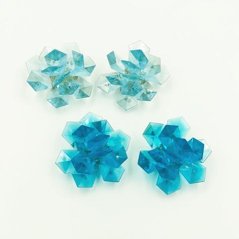GLIMRENDE 😉 vintage øreclips som hule halvkugler i halvgennemsigtig plastik med metalklips og masser af glimmer. De er store, men ret lette. Jeg har dem i seks farver; gul, lyserød, lilla, orange, blå og grøn. Dia 3 cm. De er ubrugte. Har medfødt støbemærke på kanten. Nogle har lidt ir eller mørknen af klips.