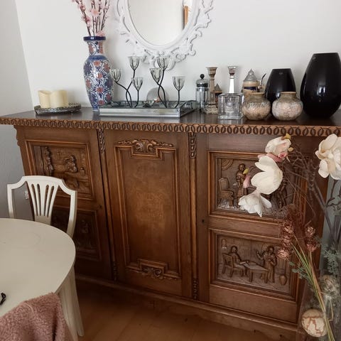 Super fin mindre kommode / TV møbel i eg. 73 x 45 x 63 cm. Med skuffe, hjul der kan låses og hul bagi til kabler. I meget pæn stand. Bordpladen har en meget svag aftegning efter noget der har stået på det, men ikke noget man ser når der står en plante, lampe eller andet på bordet (se billeder). Kan dog fjernes med en let slibning og olie/lak, hvis man ønsker.