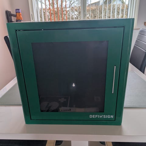 Solidt og pænt hvidt hjertestarterskab med alarm, der kan slås til og fra.