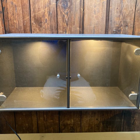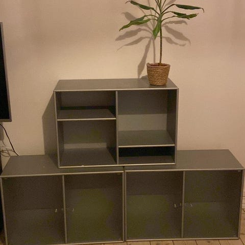 Har 1 styk Montana modul med glaslåge med messinggreb. Der hører glashylde med (som vist på billedet). Har også vægbeslag.