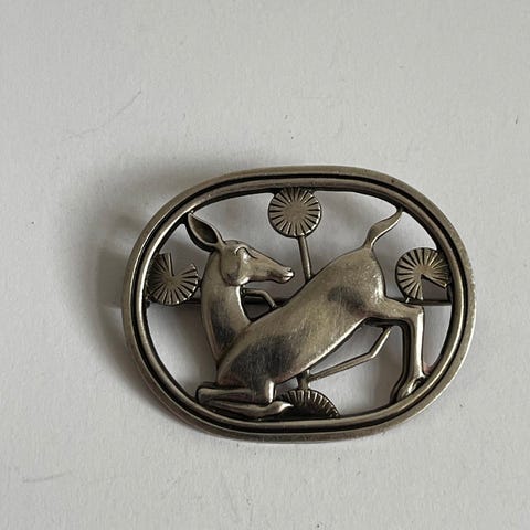 Hans Jensen broche i sølv stemplet HJ . Af Hjort bambi med blomster art deco inspireret. jagt broche skønvirke. Fremstår oxideret.