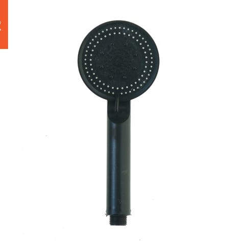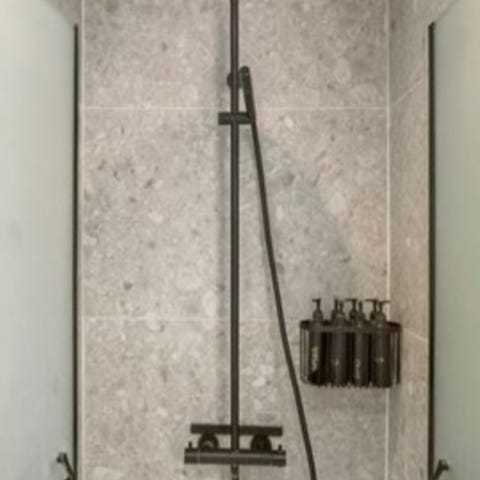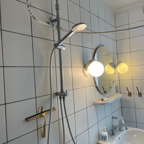 Ubrugt bruserhoved og let brugt slange i messing, købt i Messingshoppen.