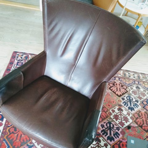 Lænestolene er i brun læder med drejefod, der er påsat armlænsforstærkning, Undersiden af siddehynden er repareret. Sælges for 900 pr. stk. Stolene er ellers velholdte og fra ikke rygerhjem.