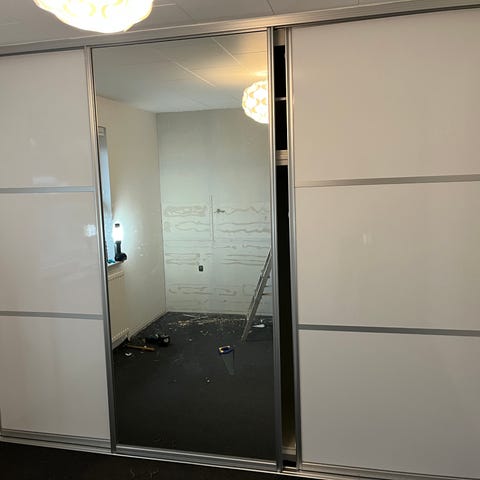 Skab med skydelåger, 8 hylder (6flytbare) 2 x skuffer 2 x bøjlestang