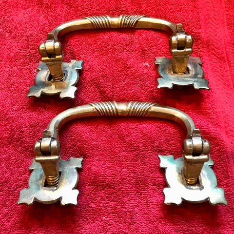 Super flote messing greb med patina til dragkiste eller andet. De er gamle og tror de er håndlavet. Skriv gerne for mere info. Vil gerne sende med GLS til pakke shop.