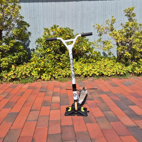 District løbehjul med hvidt aluminiumsstel. Løbehjulet har et skridsikkert deck og er designet til trickkørsel. Egnet til brug på glatte overflader og til udførelse af tricks.
