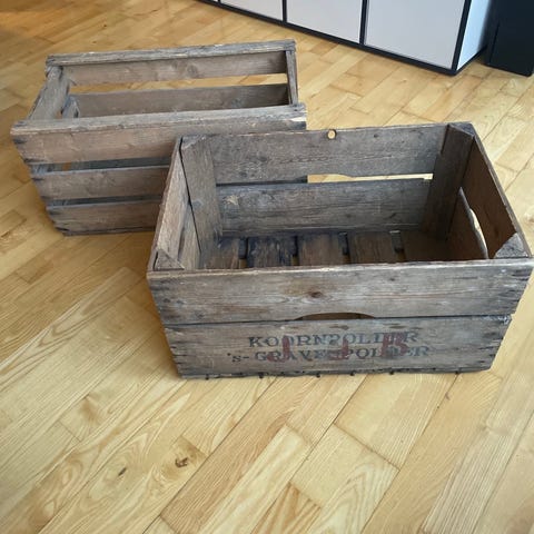 Forskellige, gamle trækasser i råt eller malet træ. Nogle er gamle ølkasser, andre nye. Og så er der de nogle kasser med tryk fra de fine vine. Hæng dem på væggen, brug dem til LP’er og anden opbevaring eller til at få drivhuset til at se lækkert ud. De lyserøde og en del andre er solgt.