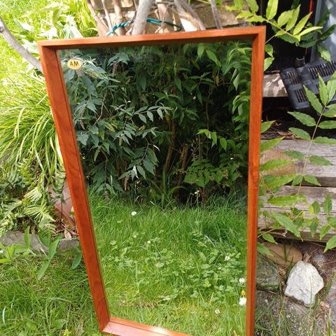 Spejl fra 70'erne med de skønneste små orange/røde kakler rundt om spejlet, der er i en teak ramme se billed nr 3.