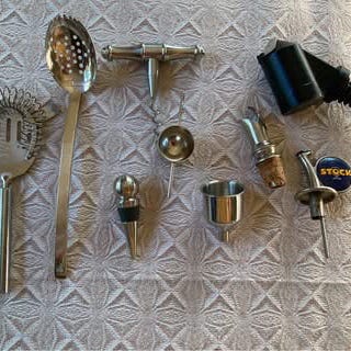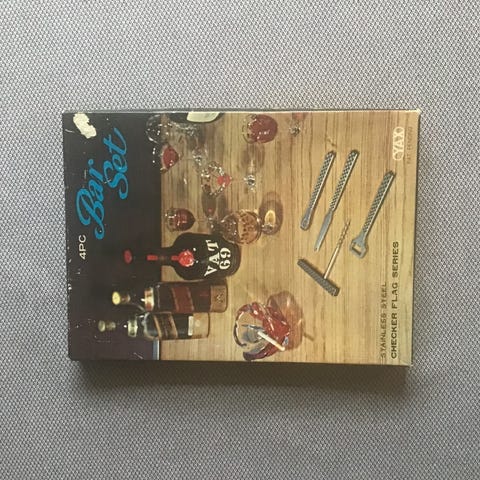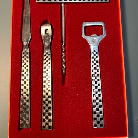 Alle dele har håndtag i smukt, mørkt teaktræ og er i meget fin stand – perfekt til retroelskere eller som gave til barvognen.