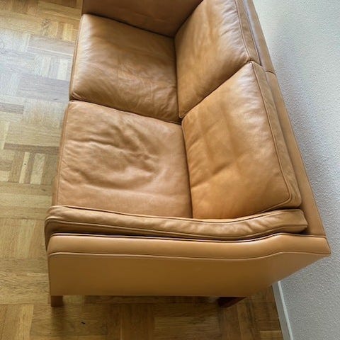 Børge Mogensen 1914-1972. Fritstående tre-pers. sofa, original betrukket med med patineret cognac anilin læder, løse dunhynder . Fremstillet hos Fredericia Stolefabrik, model 2213. Formgivet 1963. H. 76/44. L. 220, D. 80 cm. Fremstår i pæn stand. Evt kan lev aftales.