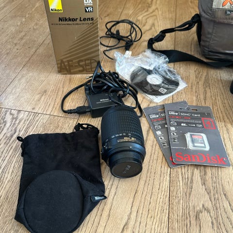 Brugt men velholdt Nikon D60 kamera. Fungerer som skal. Komplet og klar til brug. Sættet består af: