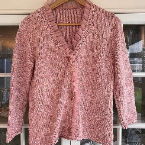 Smuk og feminin cardigan fra det eksklusive mærke Uta Raasch. Den er i flotte pink og grå nuancer, hæklet/meleret med frynser langs kanter, ærmer og forneden, som giver den et elegant og moderne look. Perfekt til både hverdag og pænere brug.
