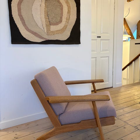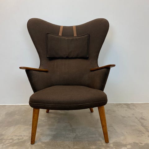 Hans j Wegner lænestol i patineret eg med grønne hallingdal uld hynder