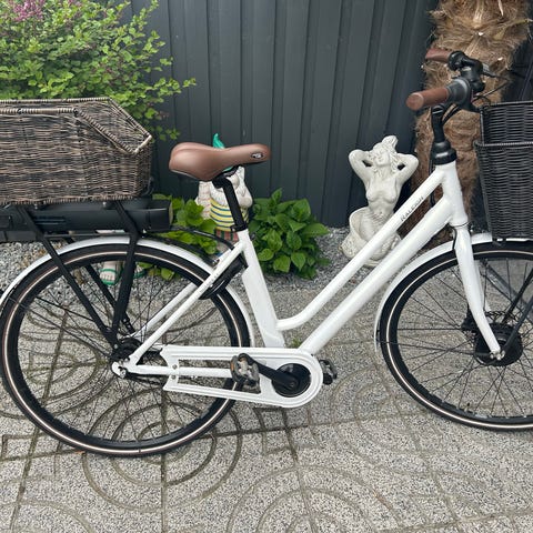 Den er udstyret med kurv foran samt integrerede lygter for og bag — perfekt til hverdags- og bybrug med komfort og stil.