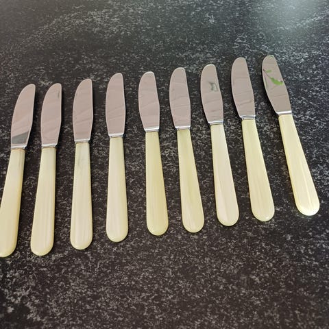 Bordknive Rose Petite fra Lundtofte. Der er 7 knive, men de 5 af dem har nogle små sorte prikker hvor kniv og greb mødes. De 2 af knivene fejler ingenting. Så man betaler kun for de to. Men jeg sender gerne de 5 med, så kan man selv tage stilling til, om de kan bruges eller ej. Pris for 2 knive 100 kr