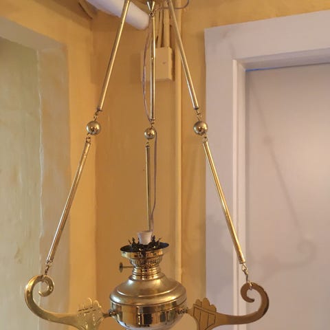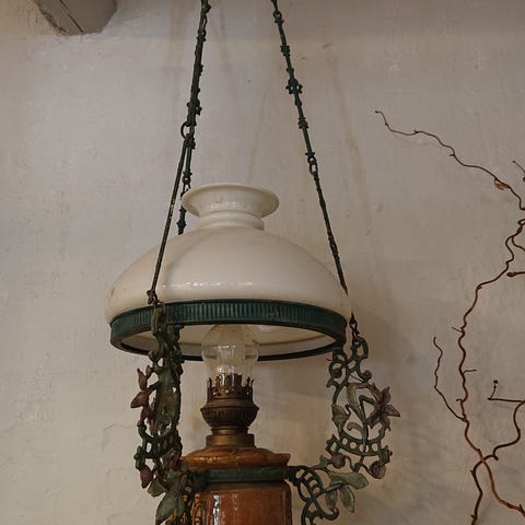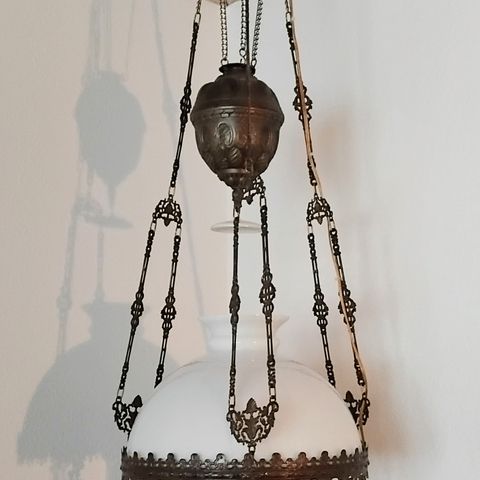 Ældre flot kirke petroleumslampe med hvide glasplader. Utrolig dekorativ og man kan, hvis er lidt fiks på fingrene , få sat en pærer i istedet . Mål: dia 62cm, højde 84cm
