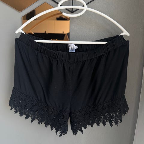 Sorte shorts fra Denim Hunter str. 38.Der er to sidelommer og 2 baglommer. Shortsene går ca. til knæ, men kan sagtens smøges op.