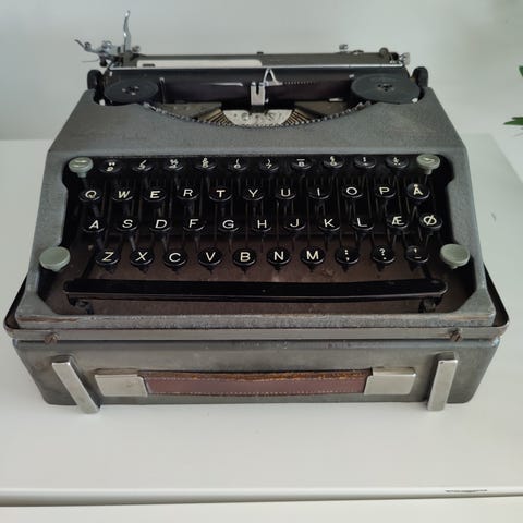 Fin Retro skrivemaskine i sort rejsekuffert, købt i 1979 af min svigerfar.