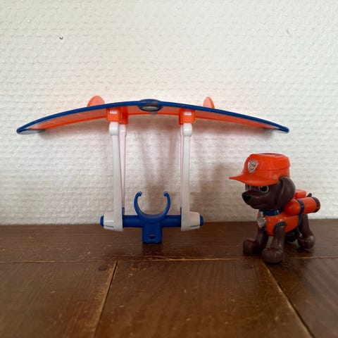 Paw Patrol Zuma figur med matchende limbo-stang. Der er hjul under maven og når figuren trækkes tilbage, kan den selv køre frem.