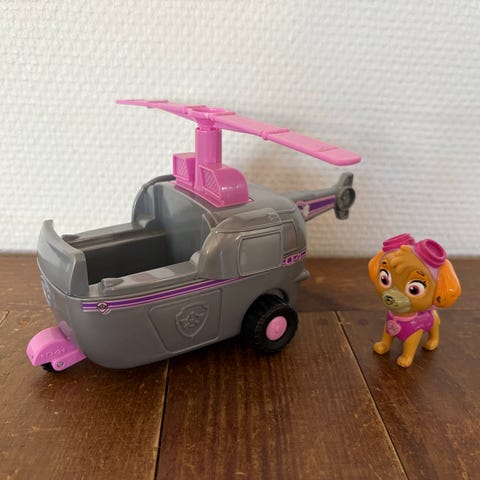 Paw Patrol Skye figur med matchende limbo-stang. Der er hjul under maven og når figuren trækkes tilbage, kan den selv køre frem.