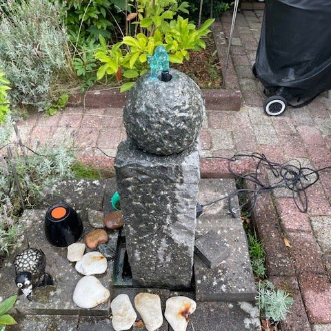 Sten med springvand. Pumpe medfølger og hvad man ellers ser på foto. Det eneste der mangler er en spand/murebalje til vandet, låget er med.