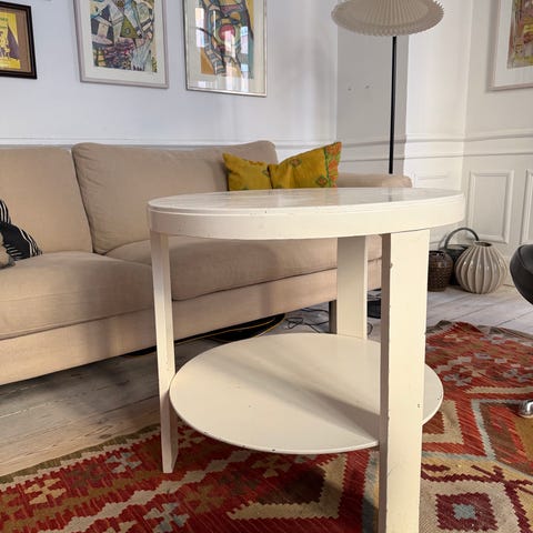 Gammelt lille sofabord rundt sofabord fremstår rent og pænt og stærkt og funktionelt højde 60 cm bredde 65 cm hvidt sofabord