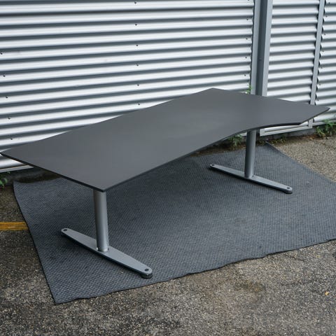 Professionelt hæve sænkebord udført i flot sort linoleum med elegant sort understel. Rigtig flot stand! Kommer med kabelbakke og flotte affasede kanter