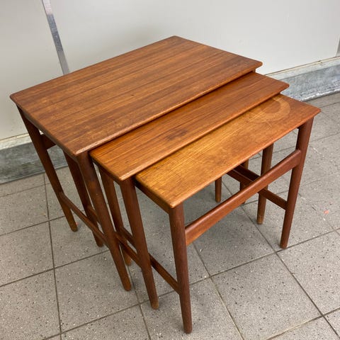 Et flot sæt indskudsborde i teak af Wegner, model CH004. Pæn stand dog med nogle minimale overfladiske skønhedsfejl i form af nogle ringe og skygger. Det største bord gaber 0,5 mm midt på i den ene side, men det ses ikke nemt - se billeder. Ingen afslag, hakker eller skader, de glider nemt ind og ud af hinanden og er yderst stærke og stabile.
