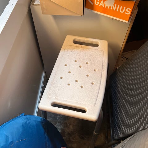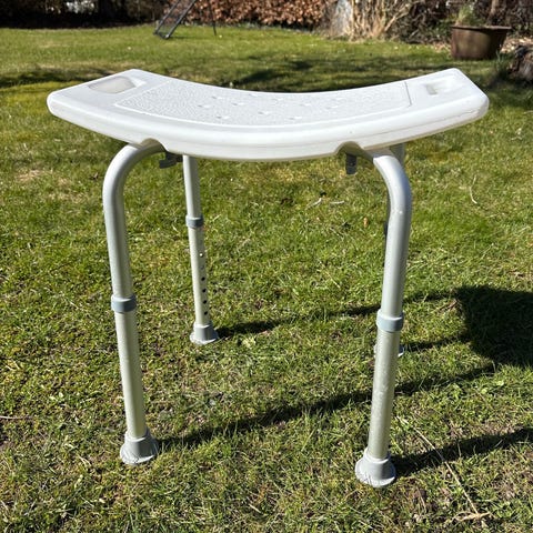 Andet, Badestol / bænk uden ryglæn., Badestol samt 1 stk badesvampe, 1 stk. lotionpåfører, begge med buet skaft. Helt nyt, kun åbnet for at tage foto.