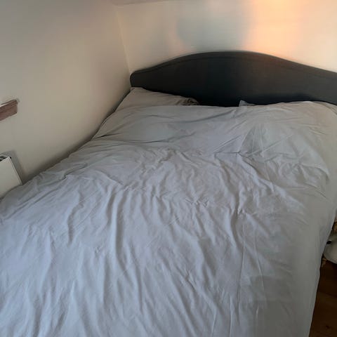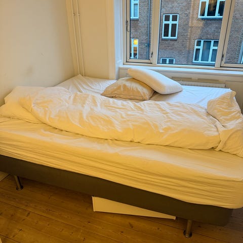 Sælger vores seng fra ikea, har stået på vores gæste værelse, den har nogle skræmmer , da vores hund har bidt i den som hvalp. Men selv sengen fejler intet, der er en god tyk madras med, den har nogle pletter. Men fungere stadigvæk. Den er vasket .