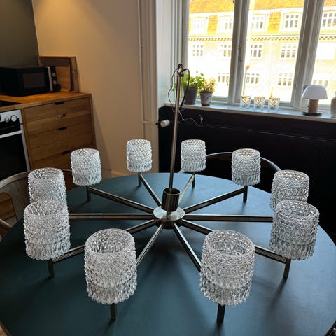 Smuk sjælden 5 armet lysekrone i stål og træ.